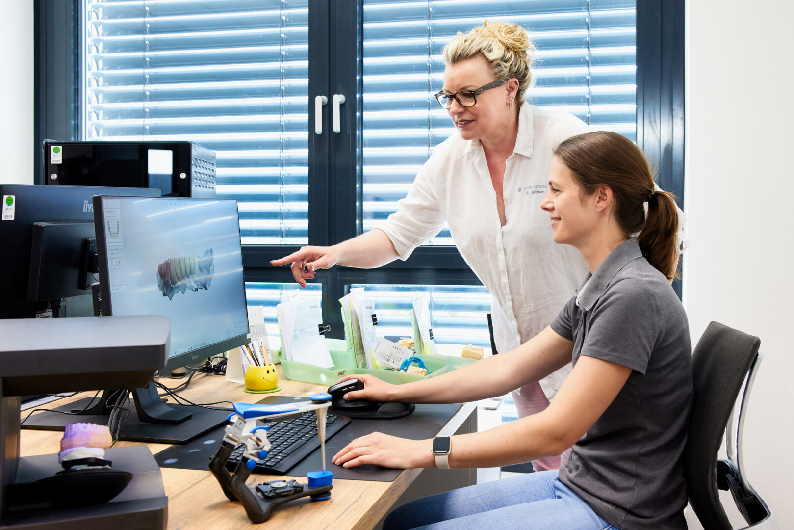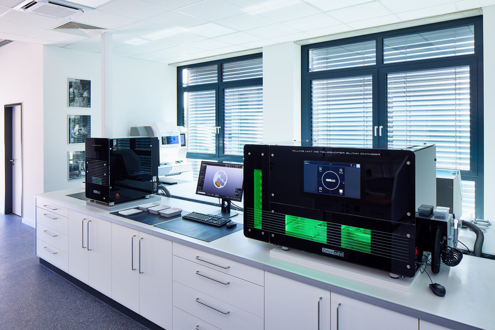 Ziel ist es, mit modernster Technik und ständiger Fortbildung aller Mitarbeiter das Know-how der neuesten Entwicklung in der Zahnmedizin und -technik in die Praxis umzusetzen und optimale Fertigungsprozesse zu etablieren. So können wir die bestmögliche Produktqualität gewährleisten. Unsere hochmodernen Fräsanlagen, Drucker und Konstruktionssoftwares sind immer Up-to-Date - genau wie unsere CAD/CAM-Spezialisten, die mit unseren Systemen arbeiten.